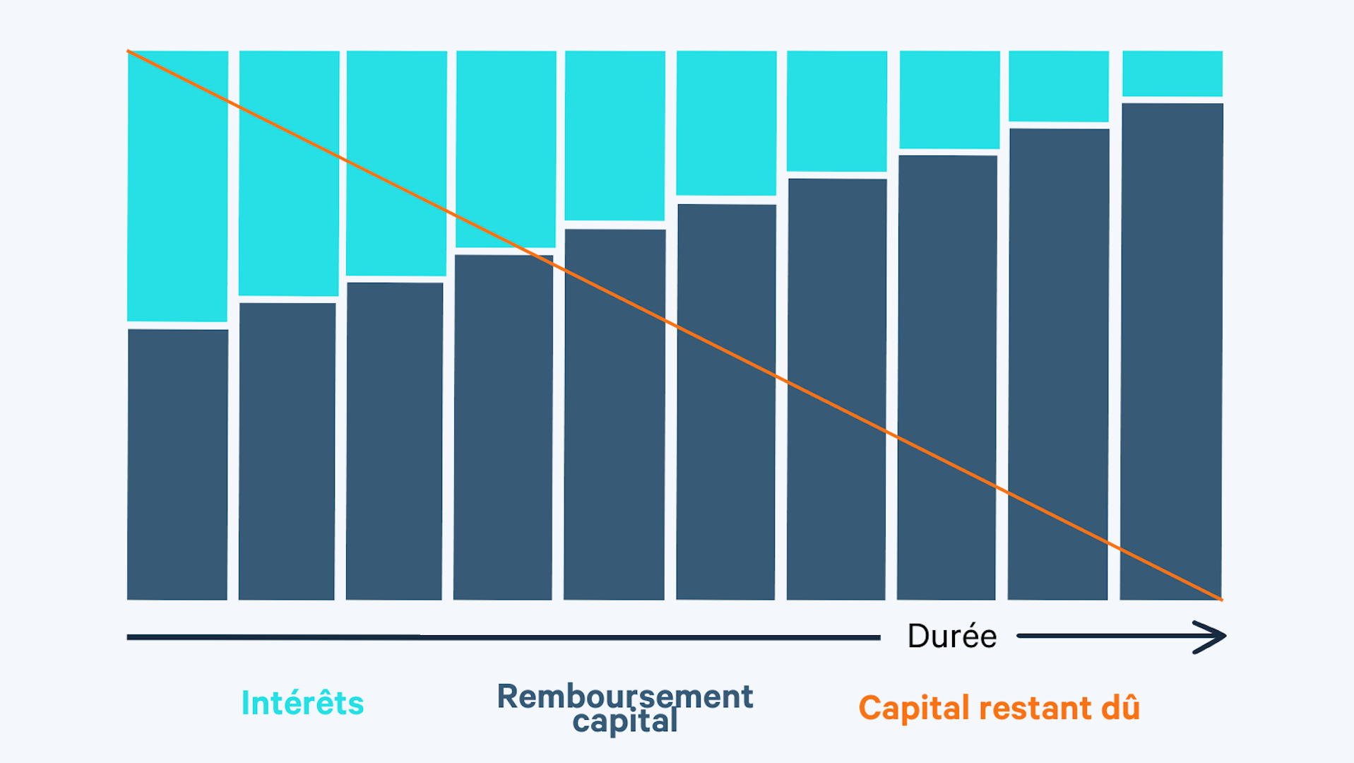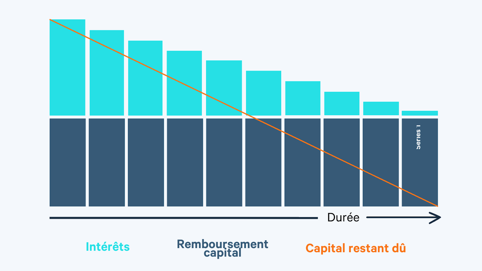 Contrairement au prêt à mensualités fixes, vous remboursez chaque mois un montant fixe de capital auquel s’ajoutent les intérêts. Comme les intérêts sont calculés sur le capital restant, la mensualité diminue progressivement.