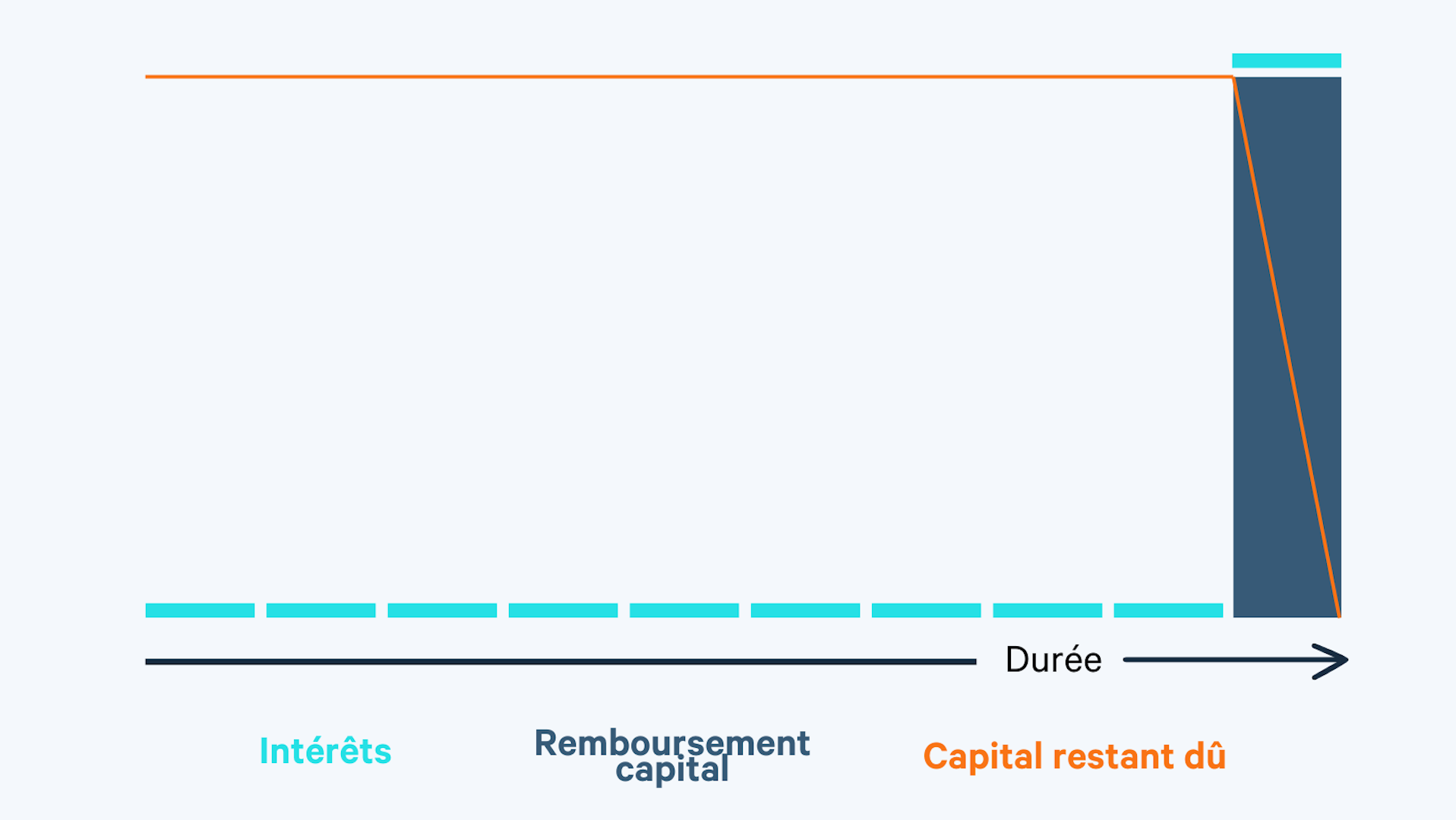 Dans cette forme particulière de crédit, vous ne payez que les intérêts sur la somme empruntée pendant toute la durée du crédit. Le capital se rembourse, lui, en une fois à l'échéance du contrat de crédit.