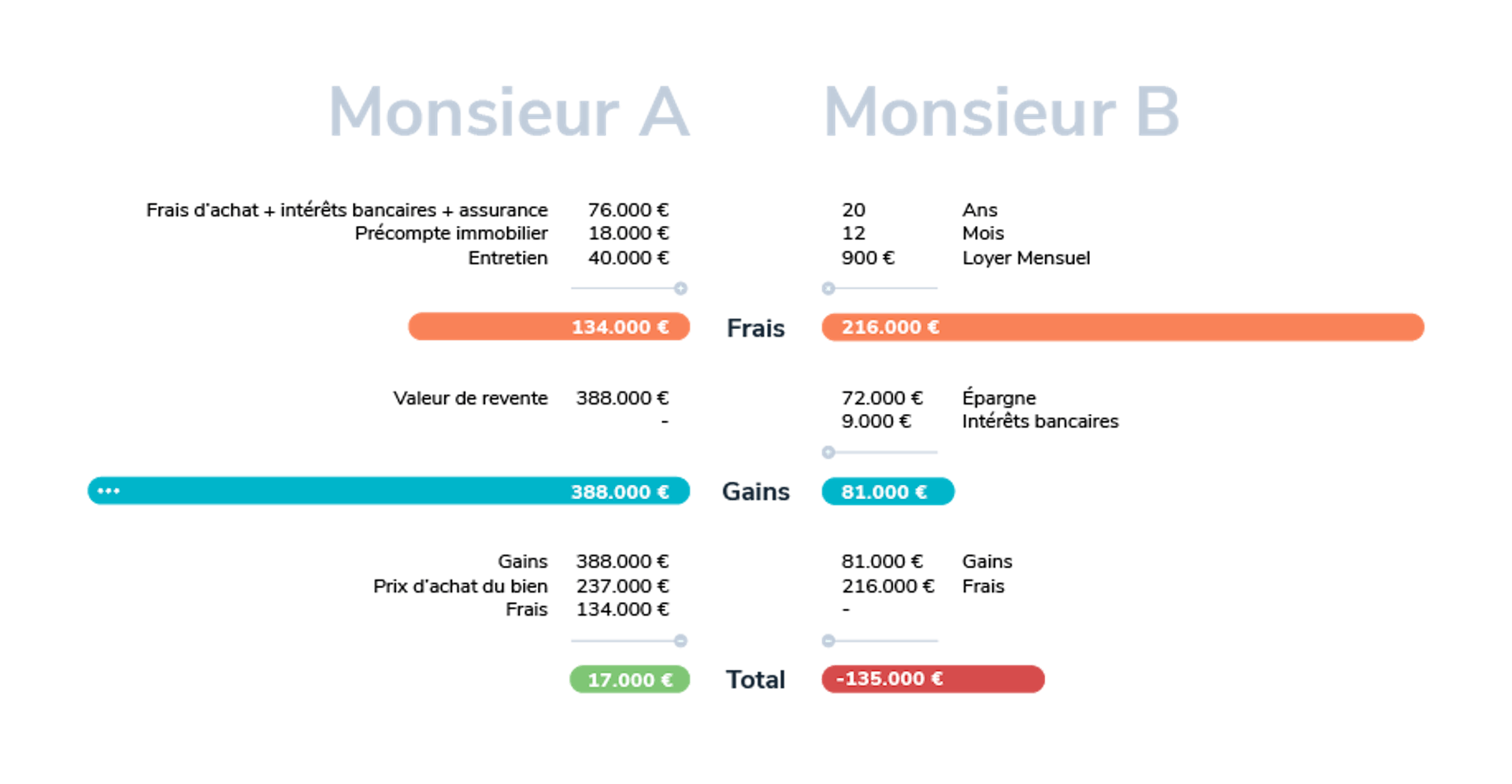 Monsieur A sera pleinement propriétaire de son appartement dont la valeur de revente s'élèvera désormais à 388.000€ (en partant sur une plus-value annuelle de 2,5%). Il ne disposera par contre d’aucune épargne. En termes d’investissement, il aura dépensé au total 134.000€ de frais pour faire l’acquisition de son appartement (reprenant les droit d’enregistrement, frais de notaire, intérêts bancaires (au taux de 2,15%), précompte immobilier, entretien de l’appartement, assurance solde restant dû, etc.).