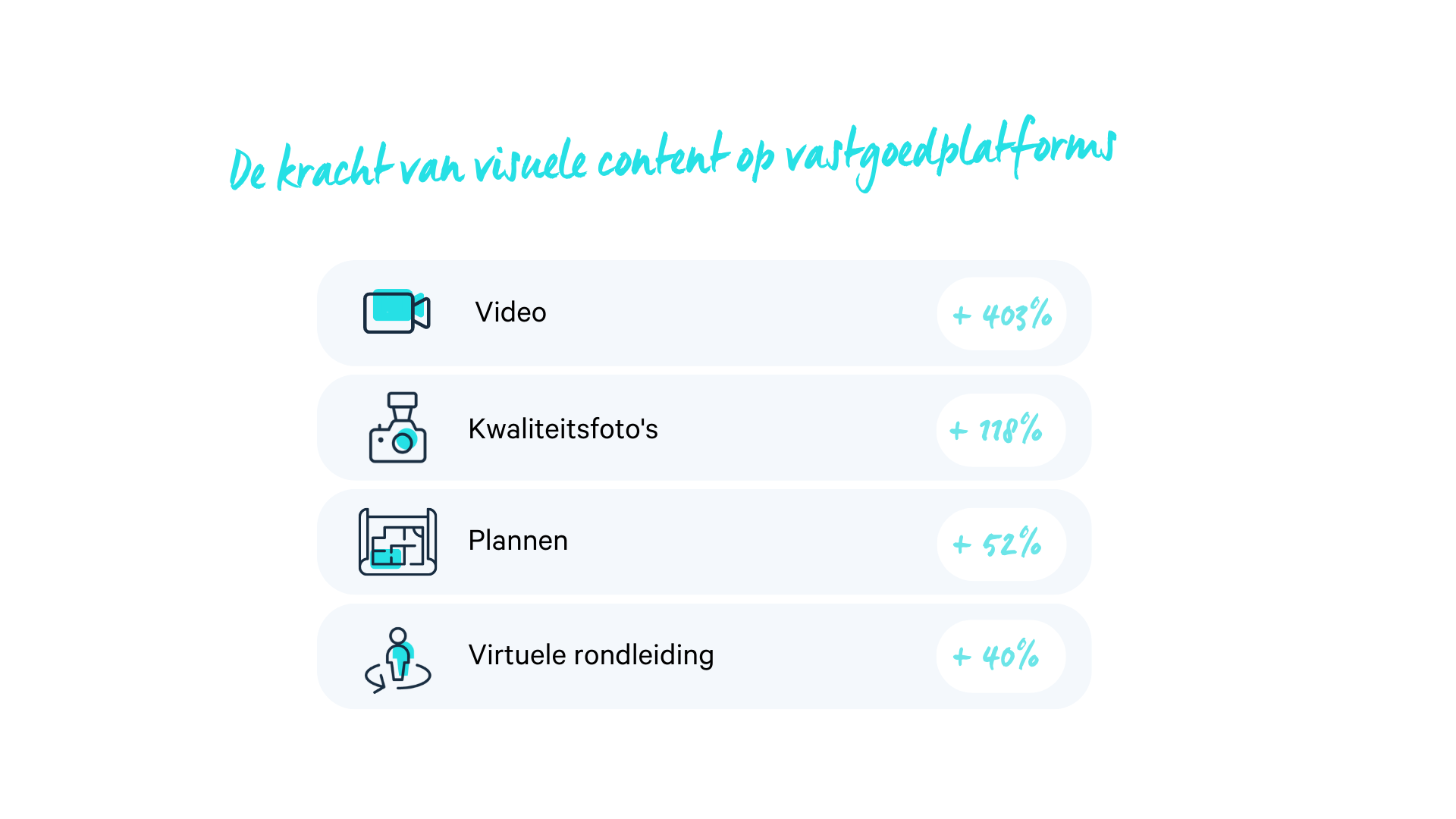 Onderscheid jezelf door uitmuntende service aan te bieden, of het nu gaat om een luxueuze villa of een studio aan zee. Dat doe je door elk pand dat je op de markt brengt uitstekend in beeld te brengen. Denk aan kwaliteitsfoto's, virtual tours & video.